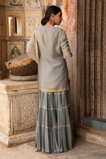 Buy_Kritika Dawar_Blue Kurta And Dupatta Tissue Sharara Foil Georgette Lining With Tiered Set _Online_at_Aza_Fashions