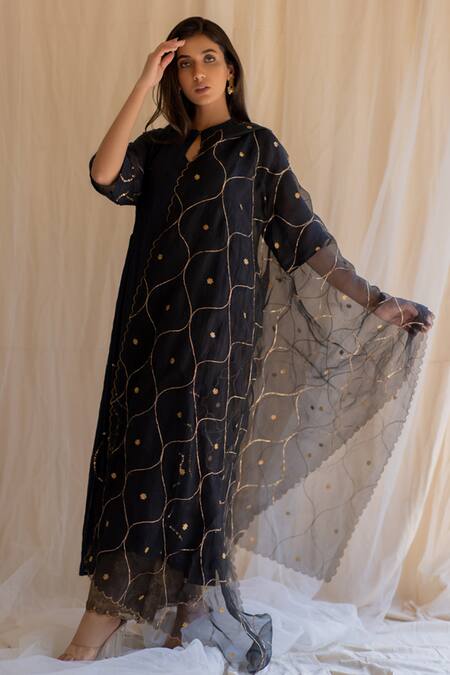 Black dupatta with all-over jaal embroidery and scallop border.
