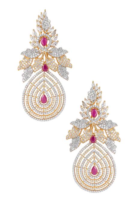 Floral top with intricate detailing, Teardrop motif drop, Encrusted with faux diamonds and synthetic rubies