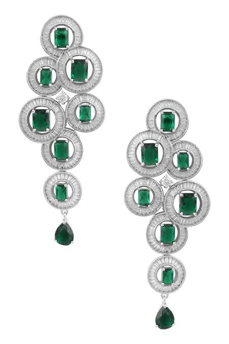 Encrusted diamonds and green stones in a circular design., Push back closure for secure fit.