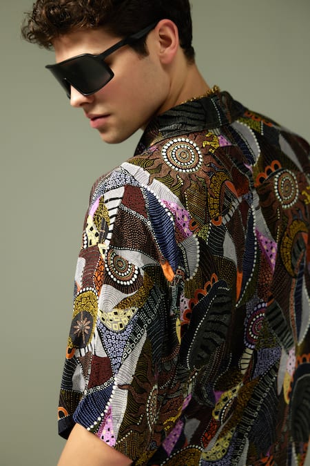 Multi color button down boxy shirt featuring an all-over solar child art print and a camp collar neckline