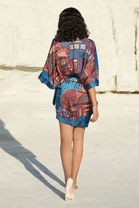 Blue robe style cover up featuring Cappadocia inspired prints and flared sleeves. Includes a separate fabric belt and has a plunge V neck with a slit on one side.