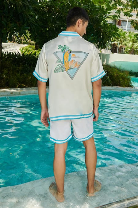 White knee-length shorts crafted from water-resistant sheeter fabric featuring minimal blue Cuban stripes