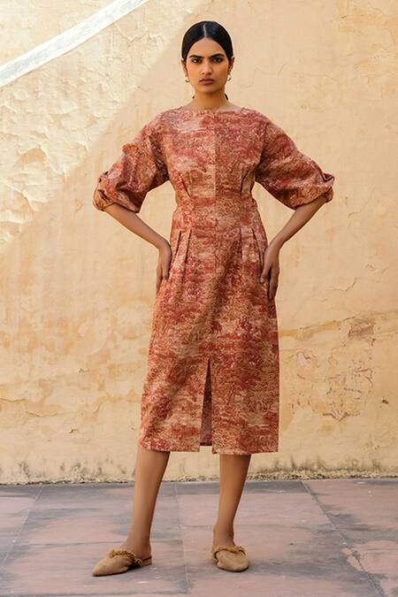 Brown empire dress with all-over toile print and boat neck.