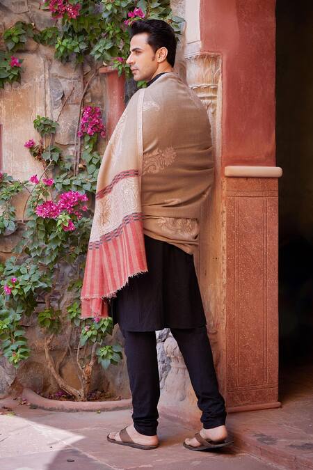 Beige pure pashmina shawl featuring placement stripe pattern and palladar botidar embroidery