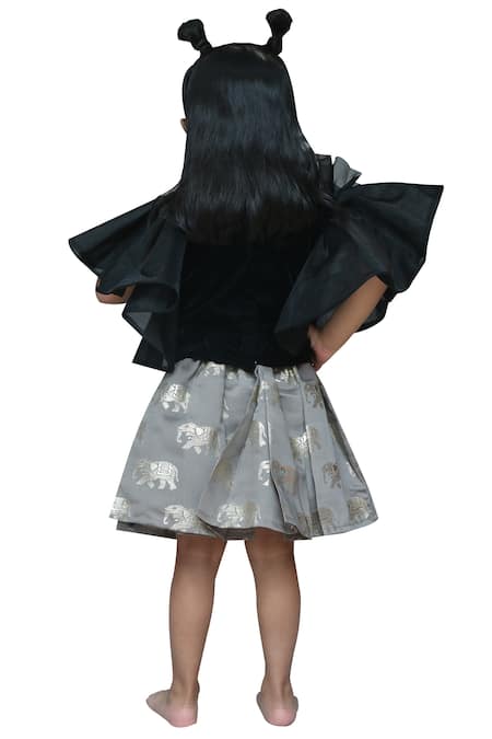 Black top featuring frill organza sleeves and a big flower detail. Paired with a grey skirt adorned with elephant prints and box pleats.