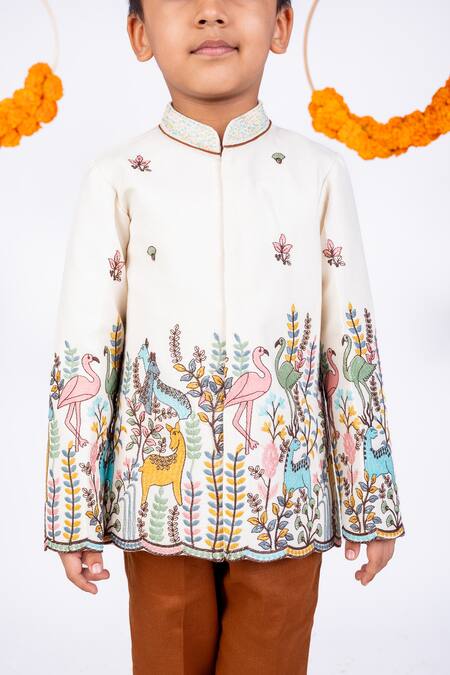 White Cotton Embroidery Animal And Bird Bandhgala Set