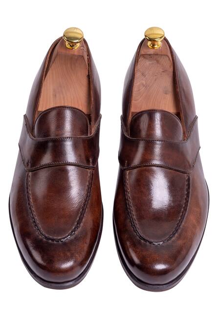 Brown European Vegetable Tanned Leather Sole Penny Loafer Shoes