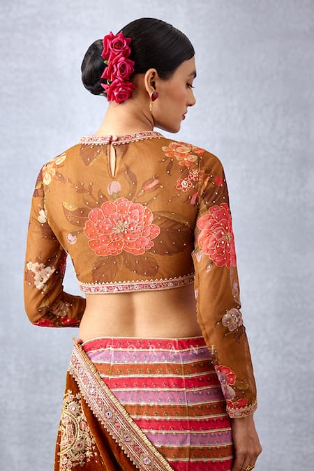 Ochre yellow sheer blouse with digital floral printed motifs, scattered sequin work and hand embroidery on the neckline and hem.
