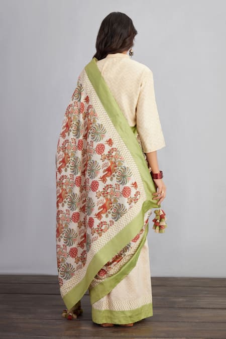 Ecru handwoven saree with floral & elephant motifs, tassel detail, polka dot panel & contrast border.