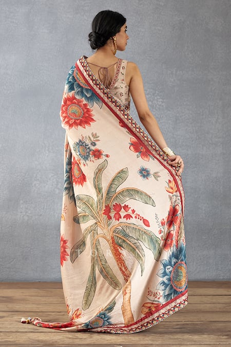 Beige saree featuring floral digital print and bead work. Paired with a padded sleeveless blouse with back tie-up.