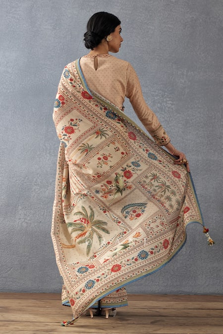 Beige saree featuring botanic digital print and bead work. Paired with a printed blouse with a back keyhole and tassel pallu.