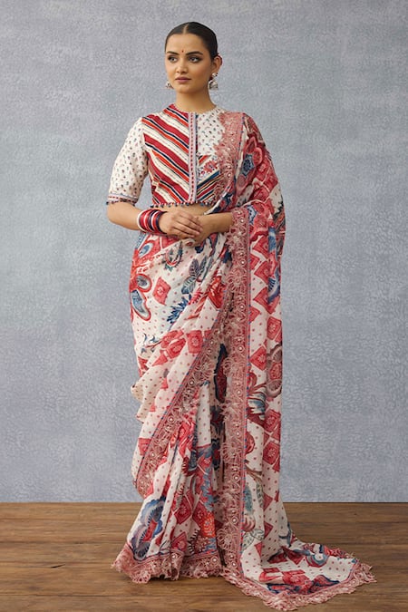 Intricate edge detailing, Mix of striped and floral patterns, Half sleeves with decorative hem