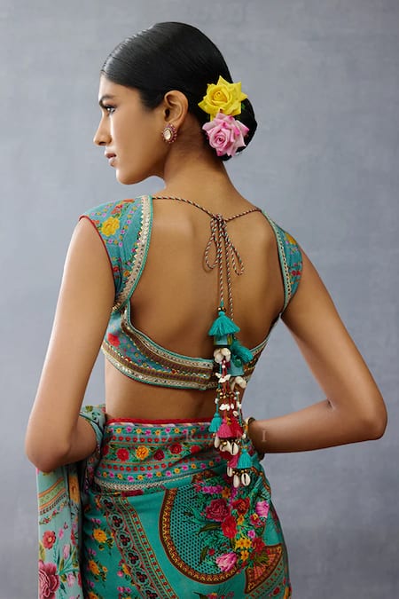Aqua blue padded blouse featuring a sweetheart neckline with floral print and embellished with sequin and resham embroidery