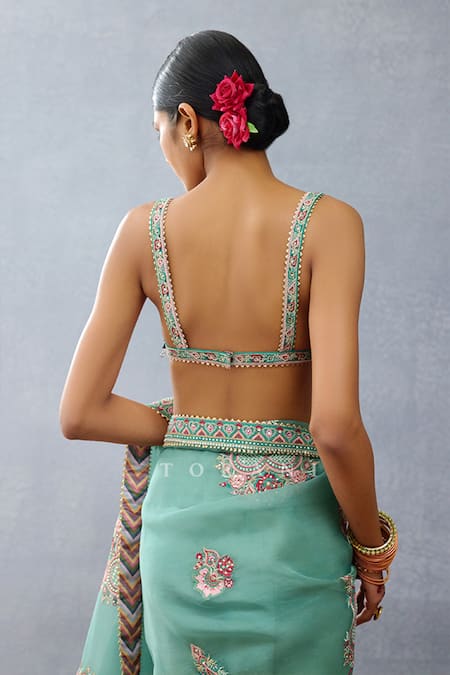 Aqua blue padded blouse featuring resham and bead embroidery with a plunging V neckline in butterfly net fabric