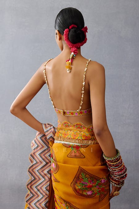 Yellow Silk Lace, Beads Plunge Neck Dil Seher Mana Floral Print Blouse