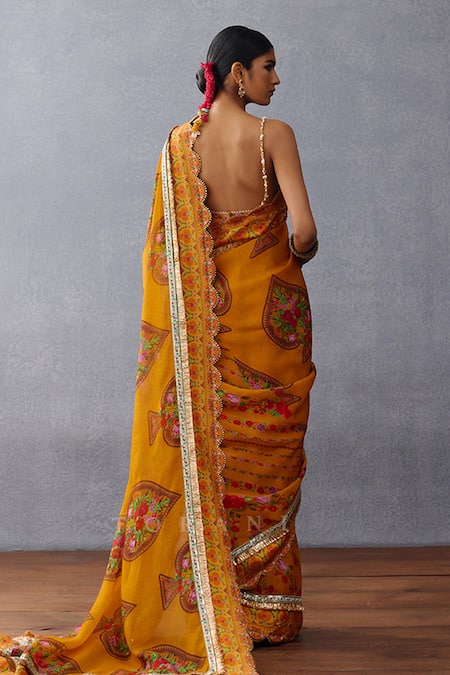 Yellow Organza Embroidery, Lace Dil Seher Mana Floral Print Scalloped Saree