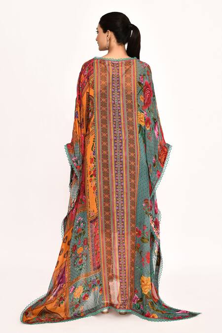 Multi colored kaftan featuring tropical floral prints and a scalloped lace border. Comes with a solid inner slip for added comfort.