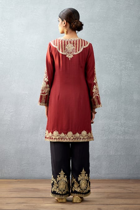 Maroon straight short kurta in slub silk base with floral embroidery. Comes with jet black pant & printed satin silk dupatta.