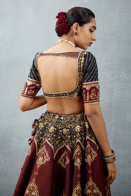 Burgundy bhagalpuri printed lehenga in heavy raw silk with side tassel tie-up. Paired with cutwork dupatta & printed blouse.