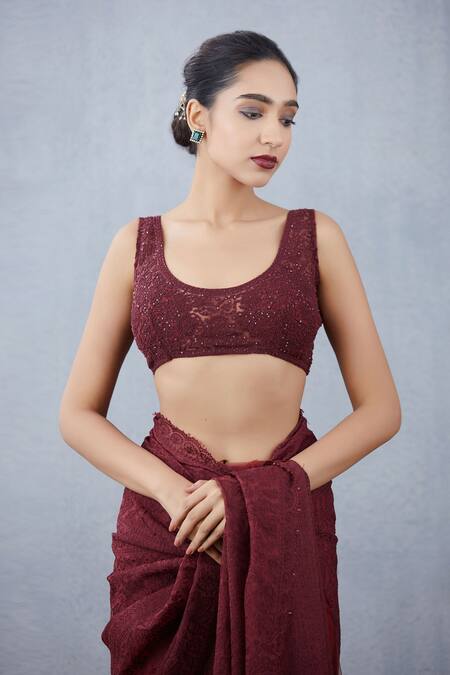 Mahogany blouse with sheer panel, all-over dori-sequin worked motifs & tassel tie-up back.