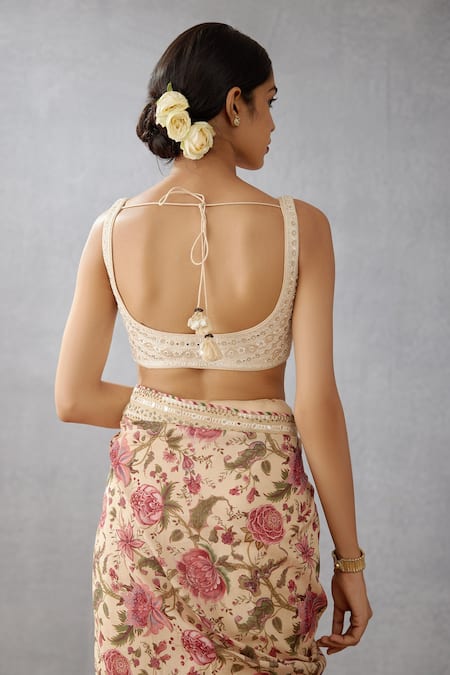 Musk beige sleeveless blouse with floral & mirror embroidery.