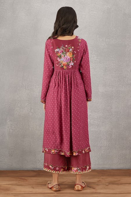 Ruby red flared long kurta with multi-color floral motif print, gathered flare & tassel detail. Comes with pants.
