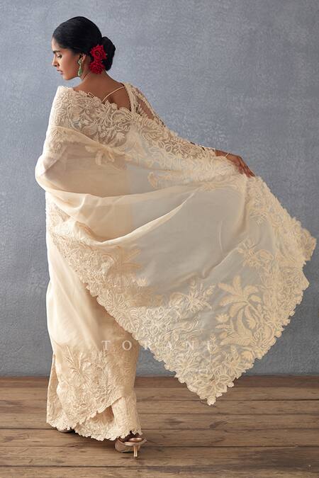 Beige Silk Organza Embroidery Asymmetric Mradu Advika Saree With Blouse