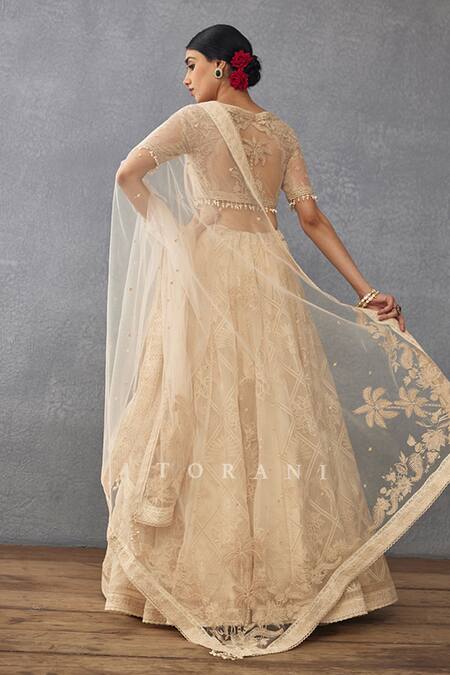 Beige Silk Organza, Cotton, Mradu Pankhuri Botanic Pattern Bridal Lehenga Set