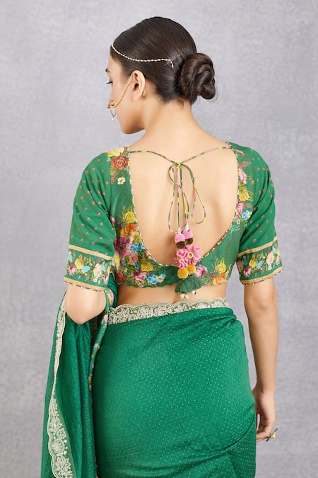 Emerald green blouse with floral multi-color printed motifs & tassel tie-up back.