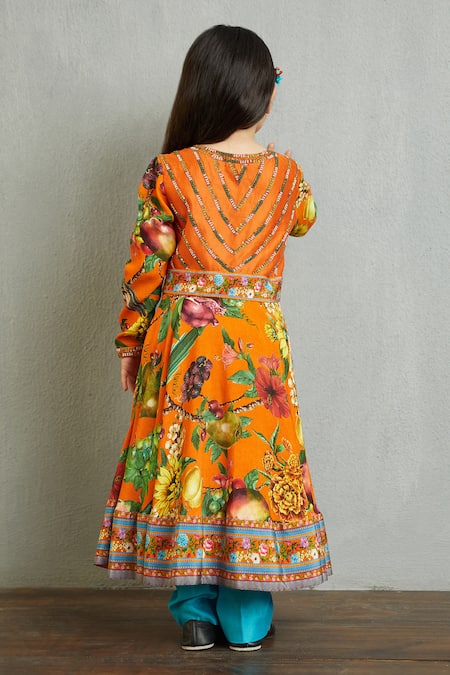 Orange handwoven chanderi anarkali featuring all-over multi-color printed motifs and placement hand embroidery. Paired with a tassel dupatta for added elegance.