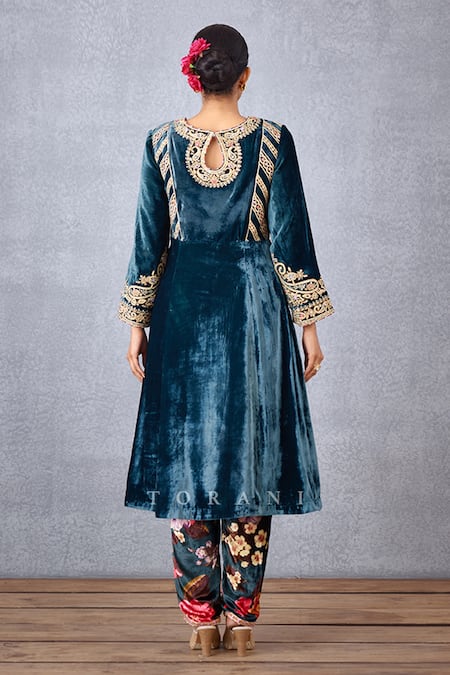 Blue Velvet, Cotton Voile And Organza Shabnami Makhmal Qurbat Kurta Set