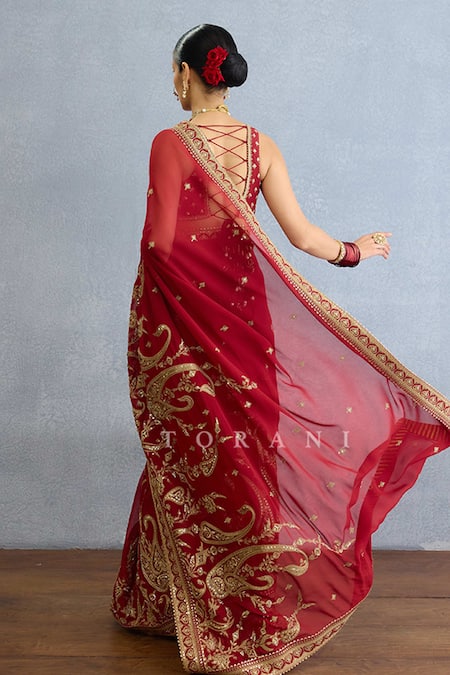 Red georgette saree featuring paisley garden embroidery with dori, badla, dabka, and sequin highlights. Paired with a sleeveless embroidered blouse with latkan tie-ups and an underskirt.
