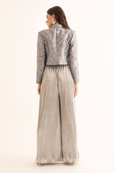 Silver Brocade Abstract Marble Pattern Crop Blazer
