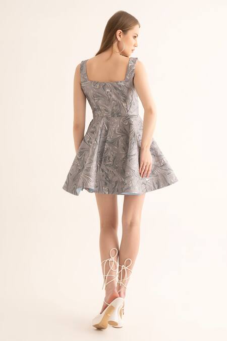Silver Brocade Square Neck Abstract Marble Pattern Skater Dress
