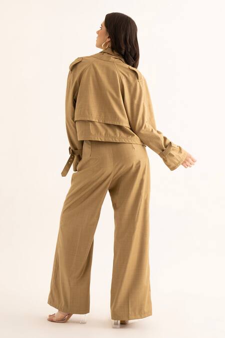 Brown crop trench jacket featuring a notched lapel collar and full sleeves