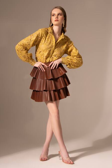 Yellow cotton shirt featuring a floral cutwork pattern and a spread collar