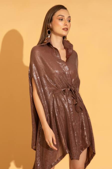 Rust kaftan dress with sequin embroidered motifs & front tie-up belt.