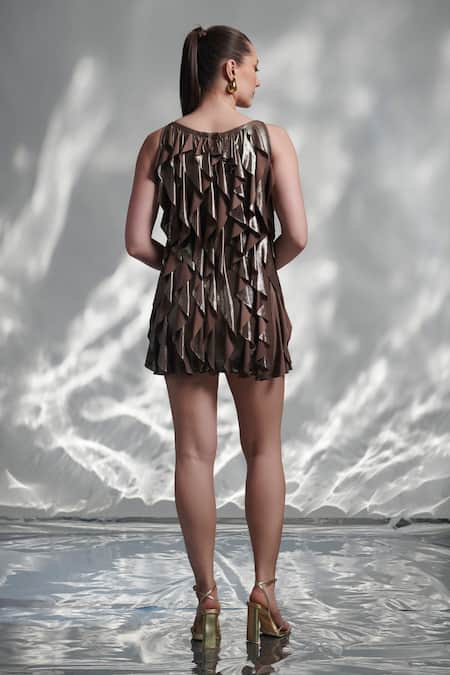 Brown tiered dress featuring all over ruffle patterns and attached lining