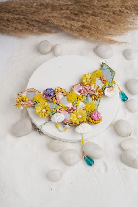 Multicolor choker featuring floral applique embellishments, semi-precious mixed stones, and shell accents