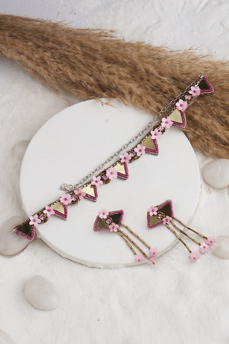 Multicolor geometric shaped choker featuring mirror, sequin & semi precious mixed stone embellishments. Paired with matching earrings that complement the choker design.
