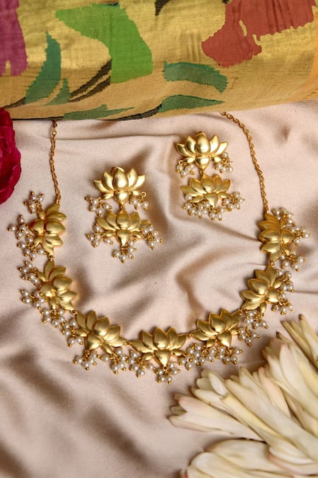 Gold padmini necklace featuring pearl clusters embellishments. Comes with a matching pair of earrings.