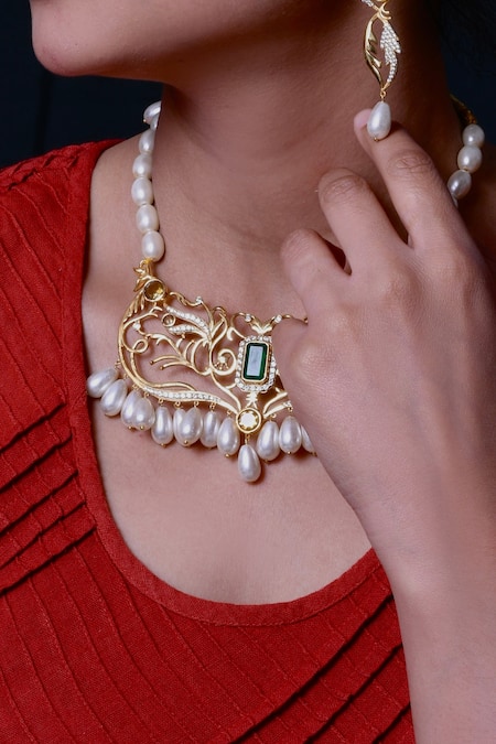 Adjustable necklace with dori closure, Intricate floral design with gemstone accents, Pearl drop detailing along the necklace