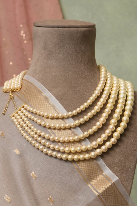 Multiple strands of pearls creating a layered effect., Lobster clasp closure for secure fit.
