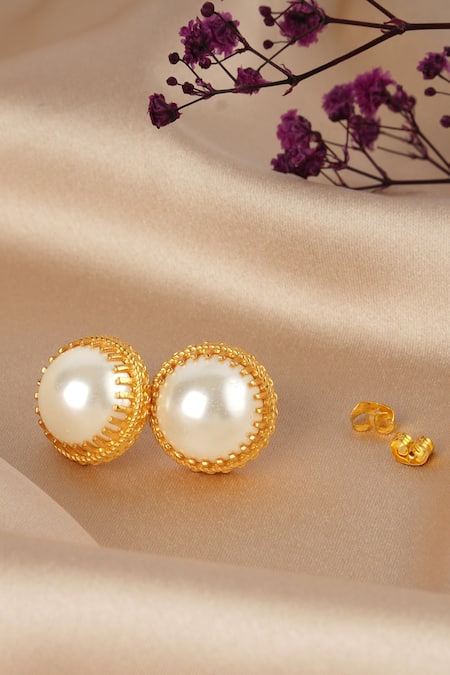 Gold plated necklace featuring pearl embellishments with a geometric pattern. Paired with matching earrings, this set is crafted from brass.