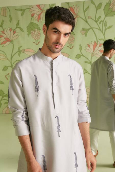 Grey cotton silk tree embroidered kurta. Paired with solid pant.