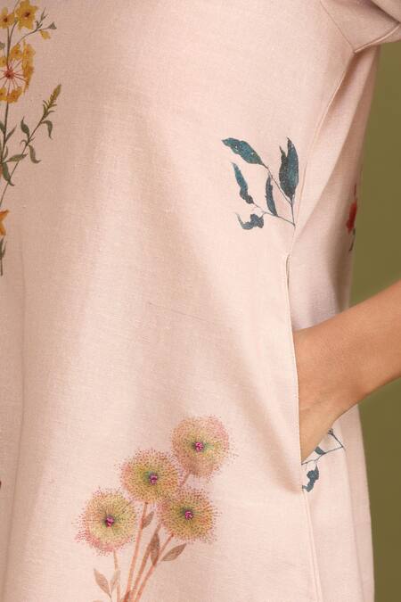 Pink Handloom Cotton Embroidery Mandarin Collar Blossom Print Kurta And Pant Set