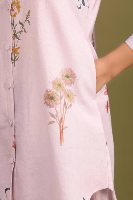 Purple Handloom Cotton Embroidery Collared Botanical Print Kurta And Pant Set