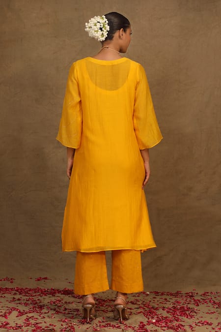Buy_Trendy Tokari_Yellow Silk, Chanderi Metallic Thread, Embroidery Dimensional Kurta Pant Set _Online_at_Aza_Fashions