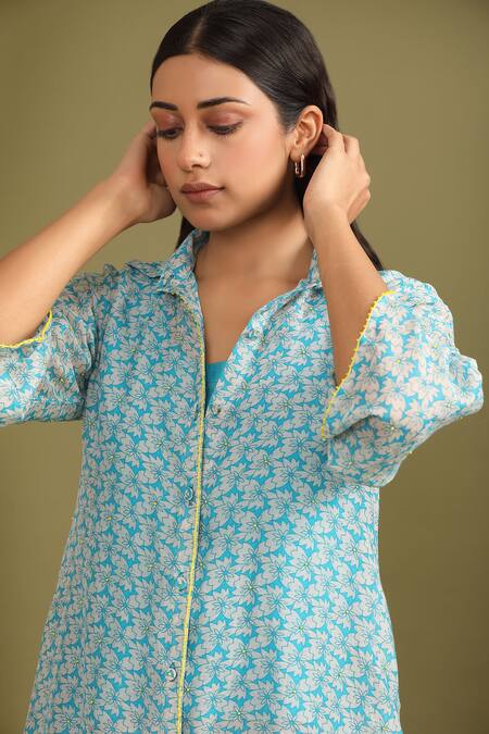 Blue Silk, Chanderi Beads Collared Ditsy Print Kurta And Pant Set